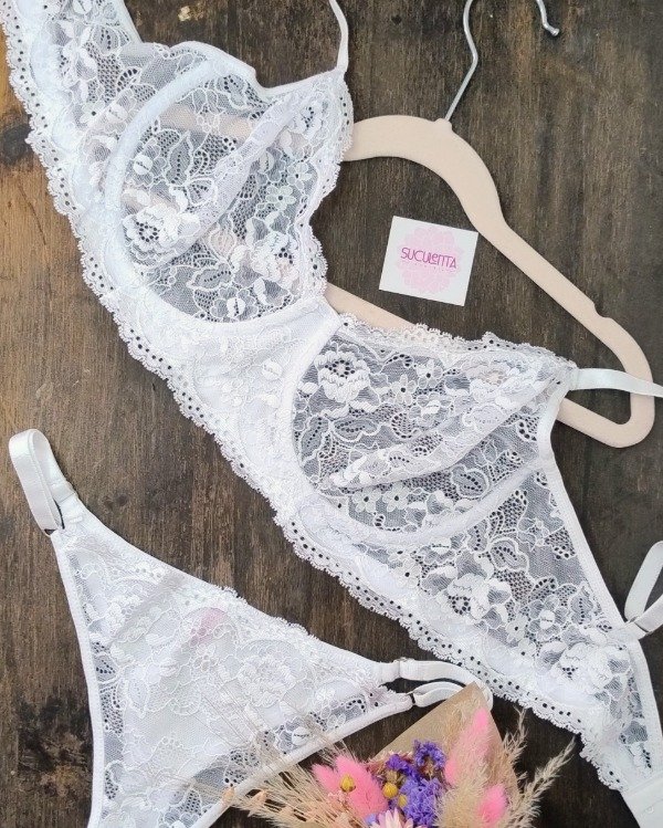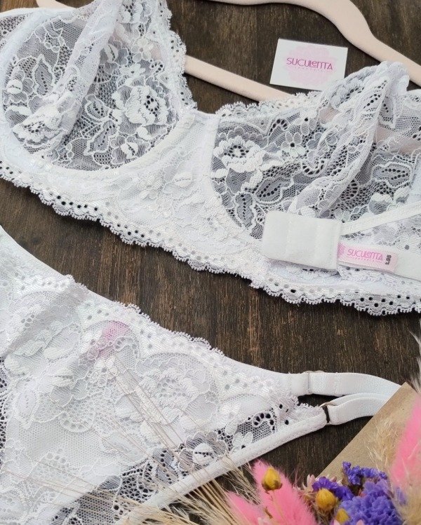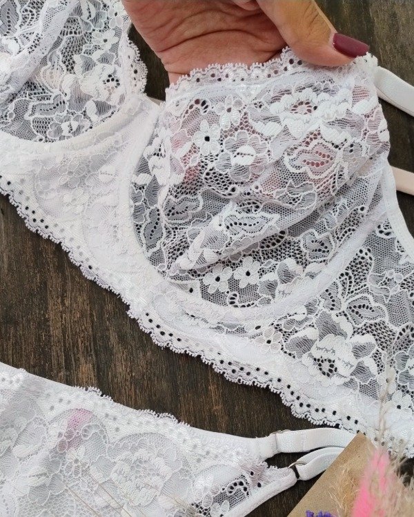 Es un conjunto de puntilla elastizada, less regulable y corpiño con arco.