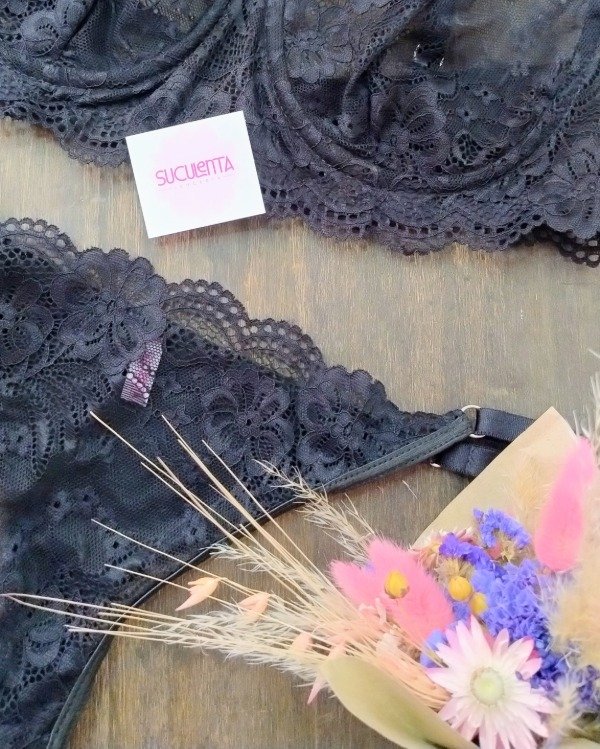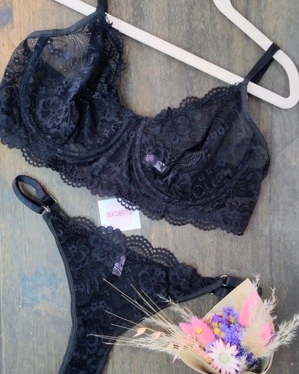 Es un conjunto de puntilla elastizada, less regulable y corpiño con arco.