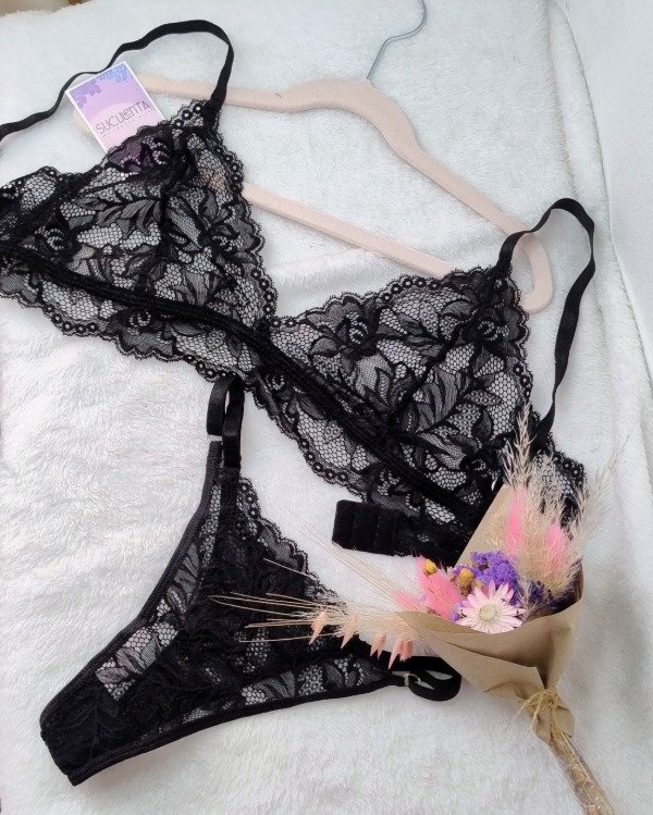 Es un conjunto de puntilla elastizada negra, corpiño bralette simple con coleta y less regulable. Está prenda tiene gancho en la espalda que permite el acceso a la prenda y regularlo para que se adapte de forma cómoda a tu cuerpo.