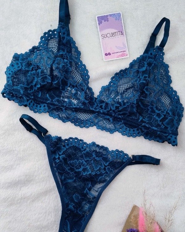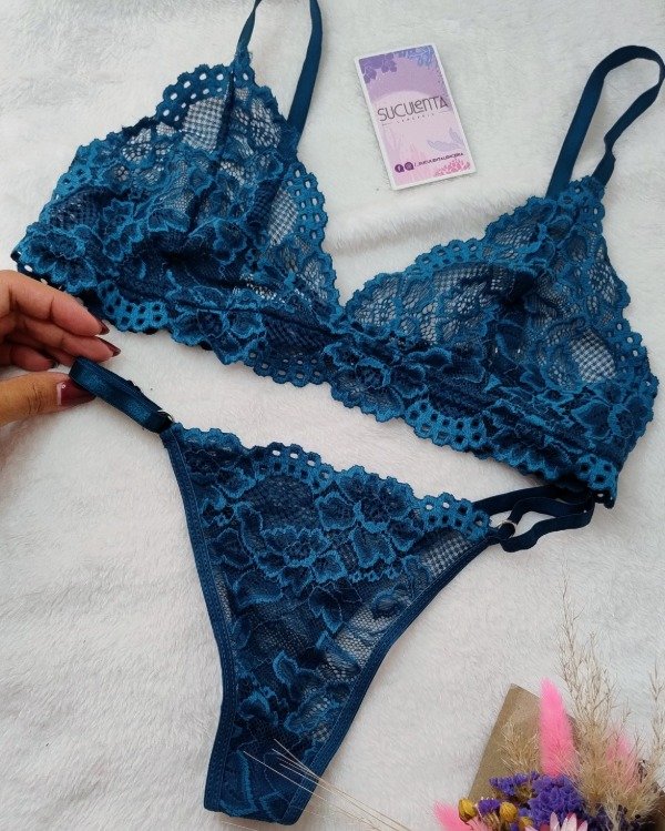 Es un conjunto de puntilla elastizada en color verde petroleo, corpiño bralette simple con coleta y less regulable. Está prenda tiene gancho en la espalda que permite el acceso a la prenda y regularlo para que se adapte de forma cómoda a tu cuerpo.