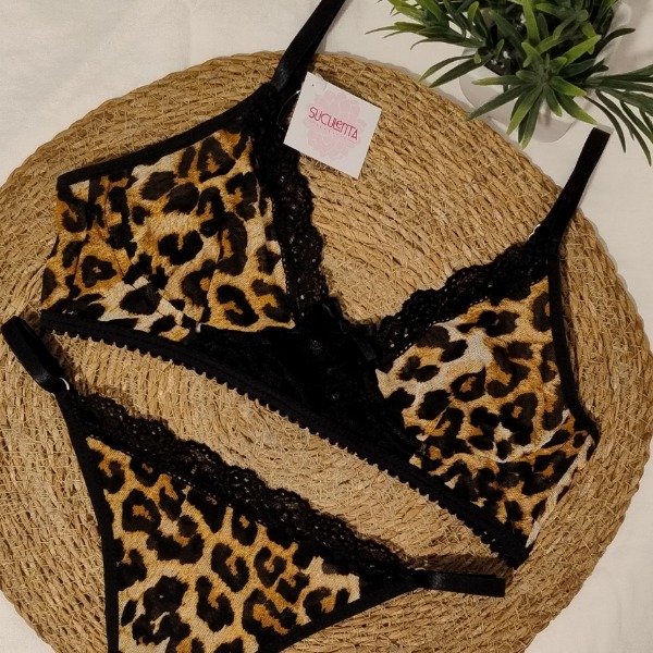 Es un conjunto corpiño de microtul estampado animal print con detalles en puntilla elastizada, falso arco. Está prenda tiene gancho en la espalda que permite el acceso a la prenda y regularlo para que se adapte de forma cómoda a tu cuerpo.