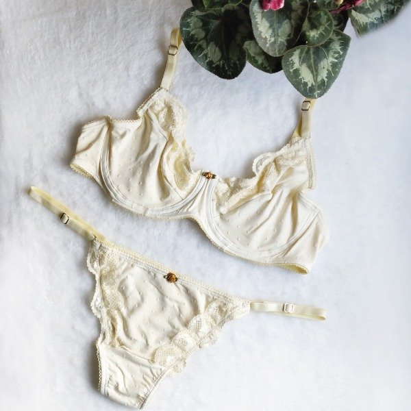 El conjunto Roma, posee corpiño de medio arco y colaless regulable. Se destaca por su calidez y delicadeza.