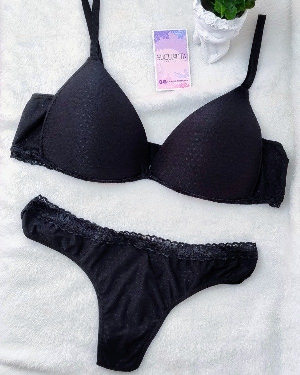 Es un conjunto de microfibra labrada de textura suave, corpiño triangulito soft sin arco.